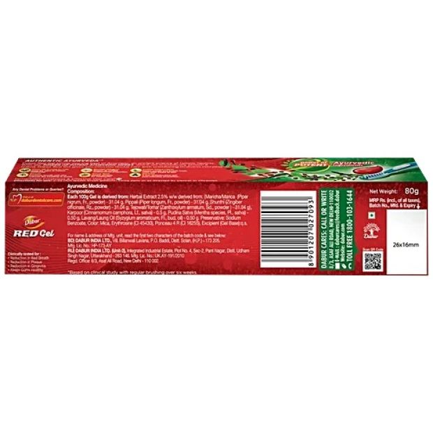 Dabur Red Gel Ayurvedic Toothpaste - Controls Bad Breath, Plaque, Gingivitis, Toothache- 80g